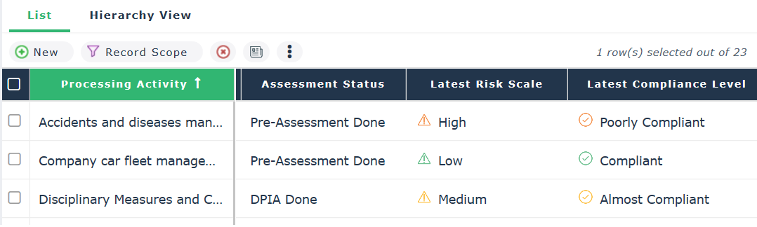The columns of the list of processing activities display computed information based on assessments (whether pre-assessments or DPIAs) such as: