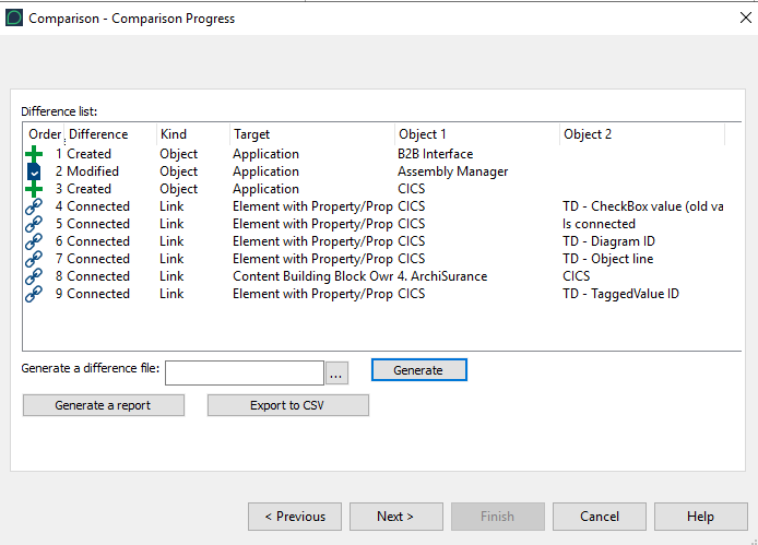 The Comparison Progress window opens. It presents the differences between compared objects and their modifications.