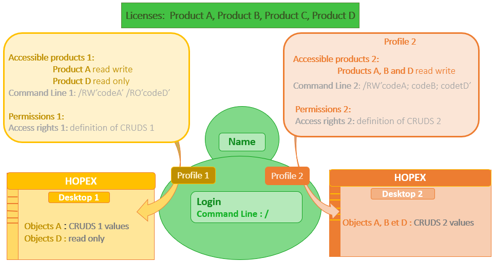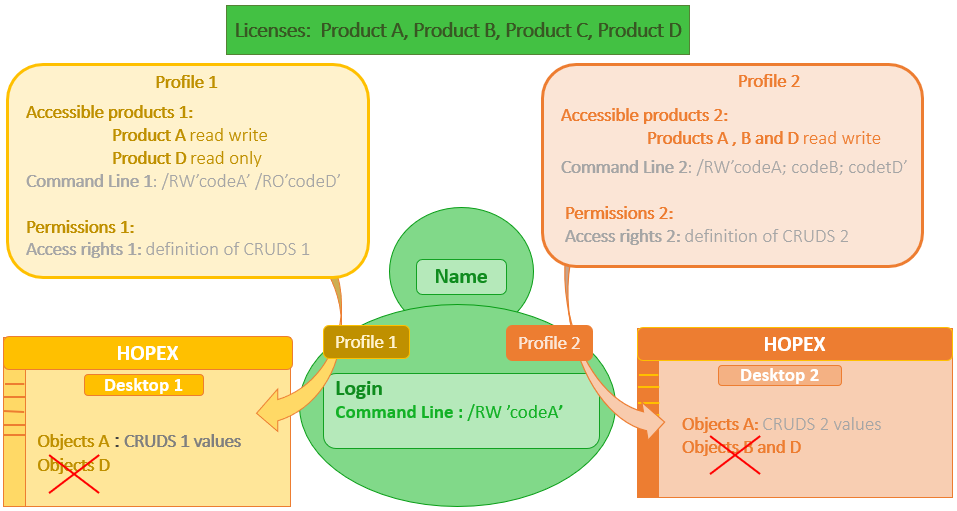 Users connecting via the group with Profile 1 have only access to objects A with the permissions defined on the Set of UI access rights of Profile 1.