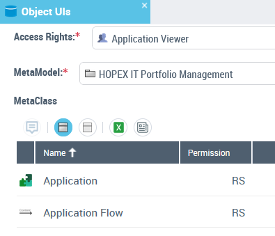 Example: the Application Viewer profile gives reading and searching access to applications (the Permission for Application MetaClass is : "RS"). This profile does not allow application creation, modification, or deletion.