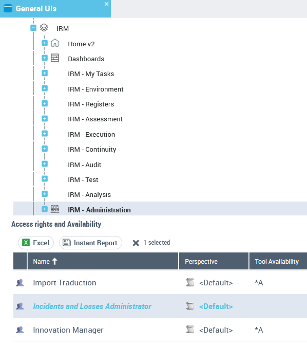 Example: the Administration navigation menu dedicated to IRM (Working Environment Template > IRM > IRM - Administration) is not available for the Incident and Losses Administrator profile.