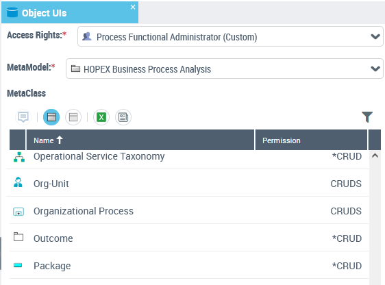 <HOPEX Default> defines default access permissions of each MetaClass, MetaAttribute, MetaAssociationEnd and tool.