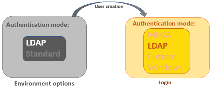 In "LDAP" authentication mode, HOPEX (Web Front-End)provides the LDAP authentication mode (by default).