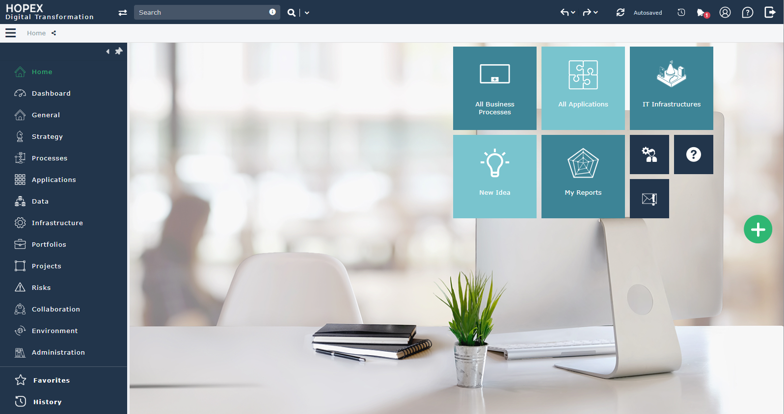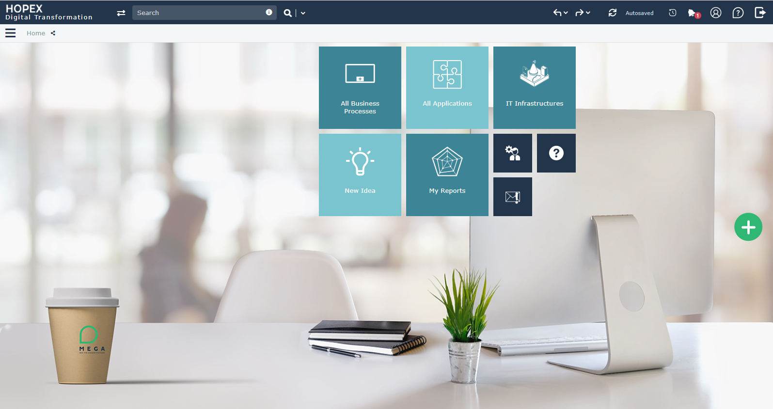All HOPEX Digital Transformation Desktop users have access to the Home pane that provide access to the tiles used in Enterprise Architecture.