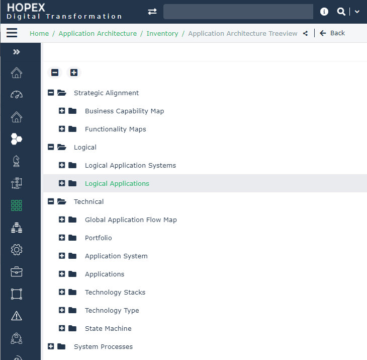 • The Strategic Alignment folder enables the definition of Business capability maps and Functionality Maps in order to prepare for the transformation of your enterprise.