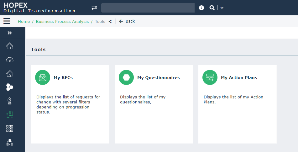 HOPEX Business Process Analysis is used to specify, implement and follow up action plans, Requests For Change and questionnaires.