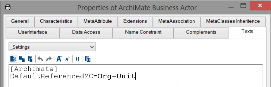 In complex cases, the default MetaClass used by the wizard is defined by a specific setting on the source ArchiMate concept MetaClass; this can be customized if necessary. For example, a Business Actor references an Org-Unit by default.