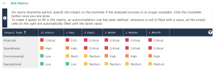 Once the IRM Manager has created a Business Impact Analysis and sent the BIA matrix to the process owner, the latter can fill in the matrix. He/she qualifies the impact of a disruption on the process of interest.