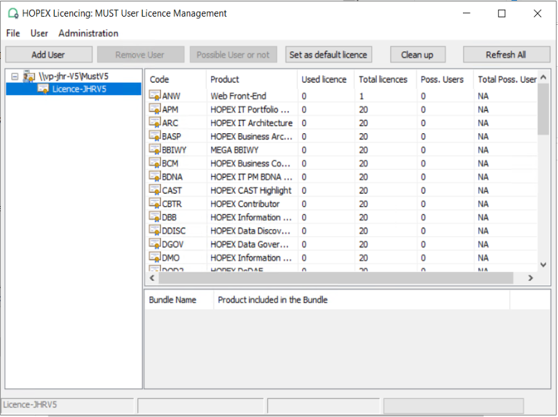 The top right pane has several columns. The list is different if a user or a licence is selected: