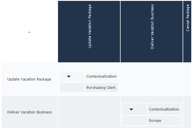 From the property page Reporting > Contextualization of a business process, you can launch a report in the form of a matrix to illustrate product offerings.