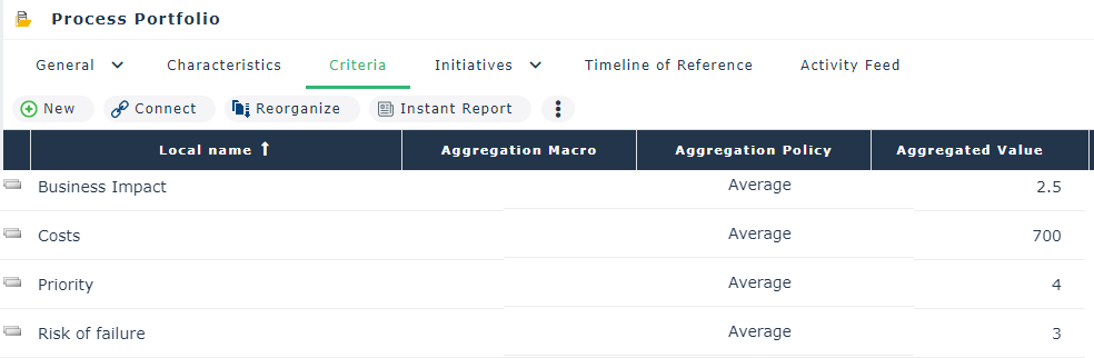 A criterion is a reference element used to compare initiatives in a portfolio. Criterion values can be predefined.