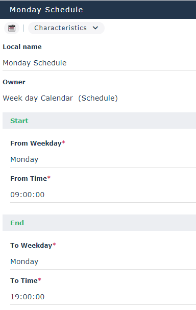 You can create a schedule to indicate that a type of employee works Mondays from 9am to 7pm and Tuesdays and Wednesdays from 8am to 6pm.