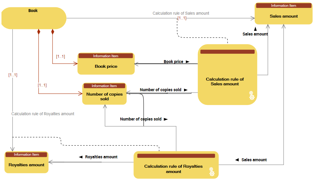 The calculation rule defines the input and output objects as well as the expression of the rule. The input and output objects can consist of different types of business information. The output objects are concepts only.