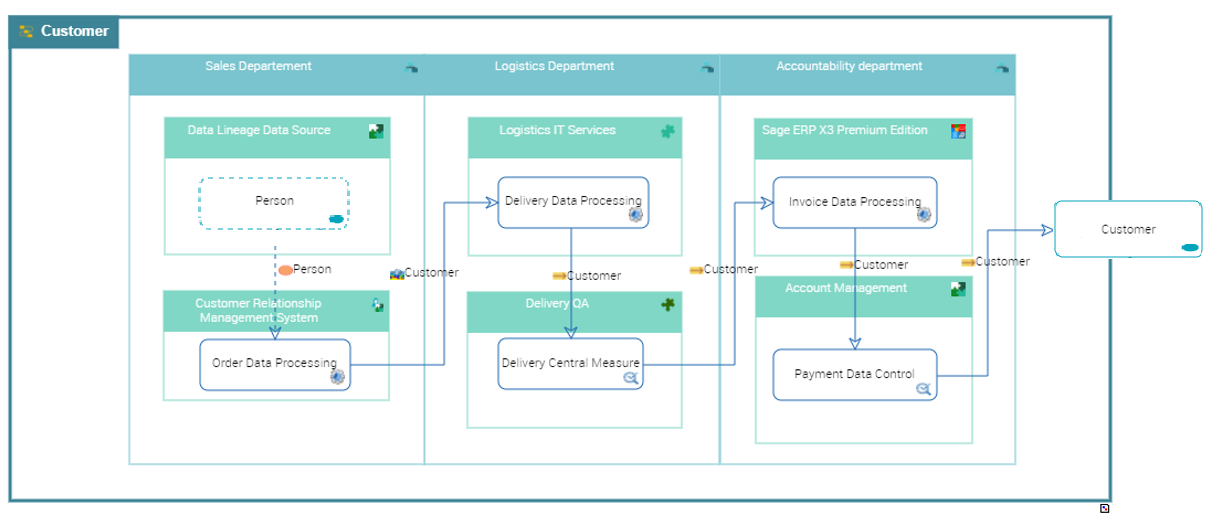 Below is an example of the lineage of the "Customer" concept: the lineage presents the path of the data, with the participating departments (Sales, Logistics, Accountability), the treatments performed and by which applications or technologies.