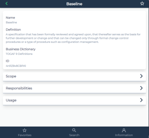 • Search for a business data by entering a character string in the search tool. The application displays the name of the associated terms, with their main characteristics.