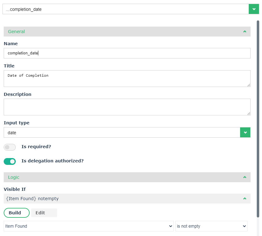 In the following example, the “completion_date” question is displayed only if the “Item found” question has been answered.
