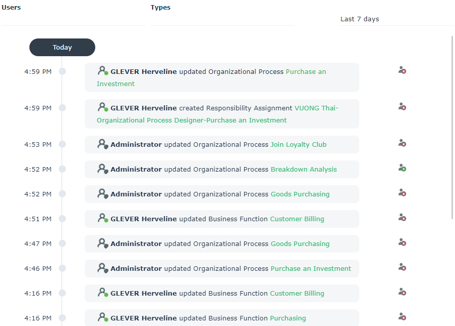 • Filter the result according to specific users and/or specific object types and/or specific tags.