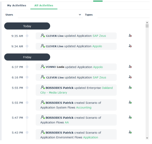 By default, the activity displays the modifications made to the objects over the last 7 days.