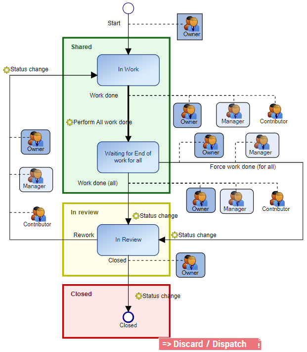 In addition to the actions available to the manager, the owner can close, and dispatch or discard the work performed within his/her collaborative workspace.