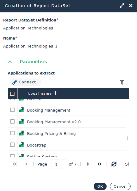 The parameters define the object groups and the way they interact in the report. They vary according to the Report DataSet Definition. A parameter value can group several objects.