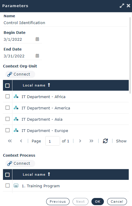 E.g.: in the case of a risk identification report, you can show the risk spread according to several criteria: by process, by risk type, by entity and by objective.