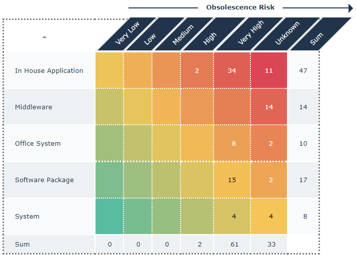 The following heatmap shows the risk of obsolescence (Very Low, Low, etc.) of a list of applications according to their type (Office System, System, etc.).