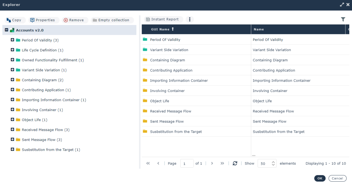 The explorer allows you to view repository objects and links and to carry out impact analyses. Its use is similar to that of the Windows explorer: objects are represented in the form of a menu tree, which allows you to navigate easily and to have an overview of all the diagrams, objects and links specified in the repository.