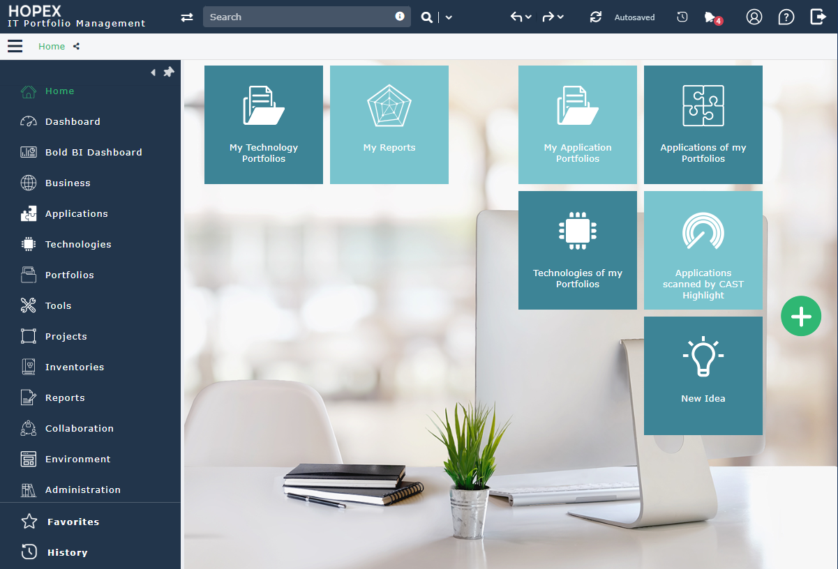 • Project Portfolios, to access the project portfolio management functionalities offered with the HOPEX IT Portfolio Management product.