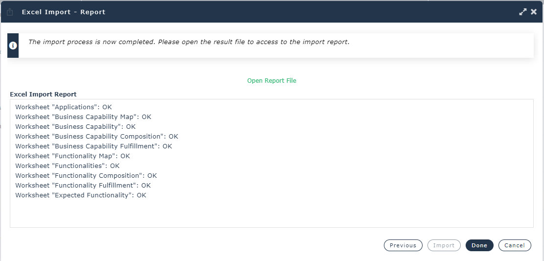 If you want to export business capability maps or functionality maps that exist in another repository than your current one, for example, you can use the Excel template of HOPEX Business Architecture & Strategic Planning.