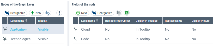 A field can replace the node object, be displayed in tooltips (by default), or replace the object name.
