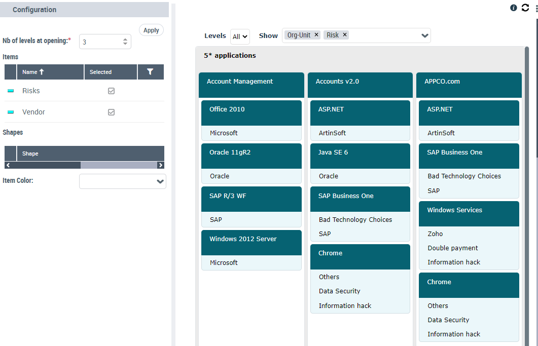 Ex. 2: this TreeSet Definition is based on the Applications that have a 5-star ranking, and displays for each of them its Technologies, and for each of its Technologies its Vendor and Risks.