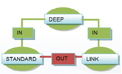 The (IN) link between the "DEEP" object and the "STANDARD" object is taken into account in building the set of links. The (IN) link between the "DEEP" object and the "LINK" object is taken into account in building the set of links. The (OUT) link between the "STANDARD" object and the "LINK" object is not taken into account in building the set of links.