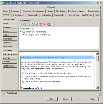 Inheriting from Variable Object will add a General/Variations tab in the property pages of the extended concept. This tab shows information related to the variation lineage.