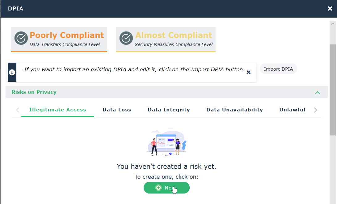 1. In the DPIA Risks on Privacy section, click New to create a risk in one of the tabs corresponding to the different risk types: