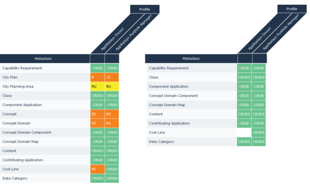 E.g. the permission comparison report of Application Portfolio Manager and ITPM Functional Administrator, here you can see the permissions of some of the MetaAttributes of Application MetaClass.