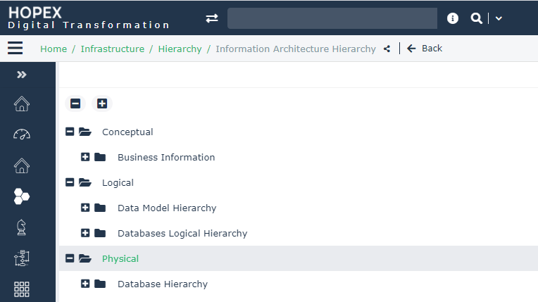 • The conceptual level enables the definition of the business function architecture concepts available with HOPEX Information Architecture;