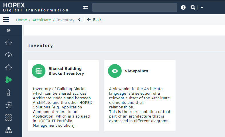• The Shared Building Blocks Inventory provides an access to the set of repository objects shared between HOPEX solutions and HOPEX for the ArchiMate® Framework.