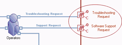 In the example here, the support service is linked to two interactions, based on the same contract, that represent activation of one support center or another as a function of time slot.
