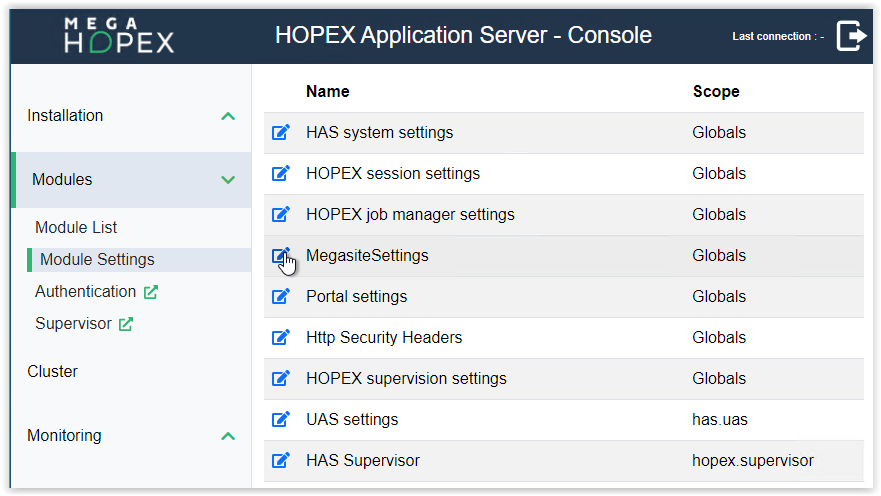 • Default Identifier: “System” with the appropriate password. Default is Hopex.