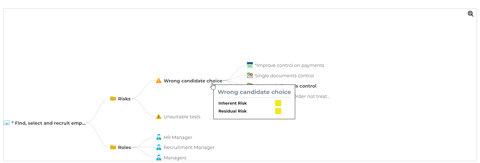The BIA Impacts report is a dendrogram which displays risks, applications, and technologies. You may click the elements of the dendrogram to expand the report.
