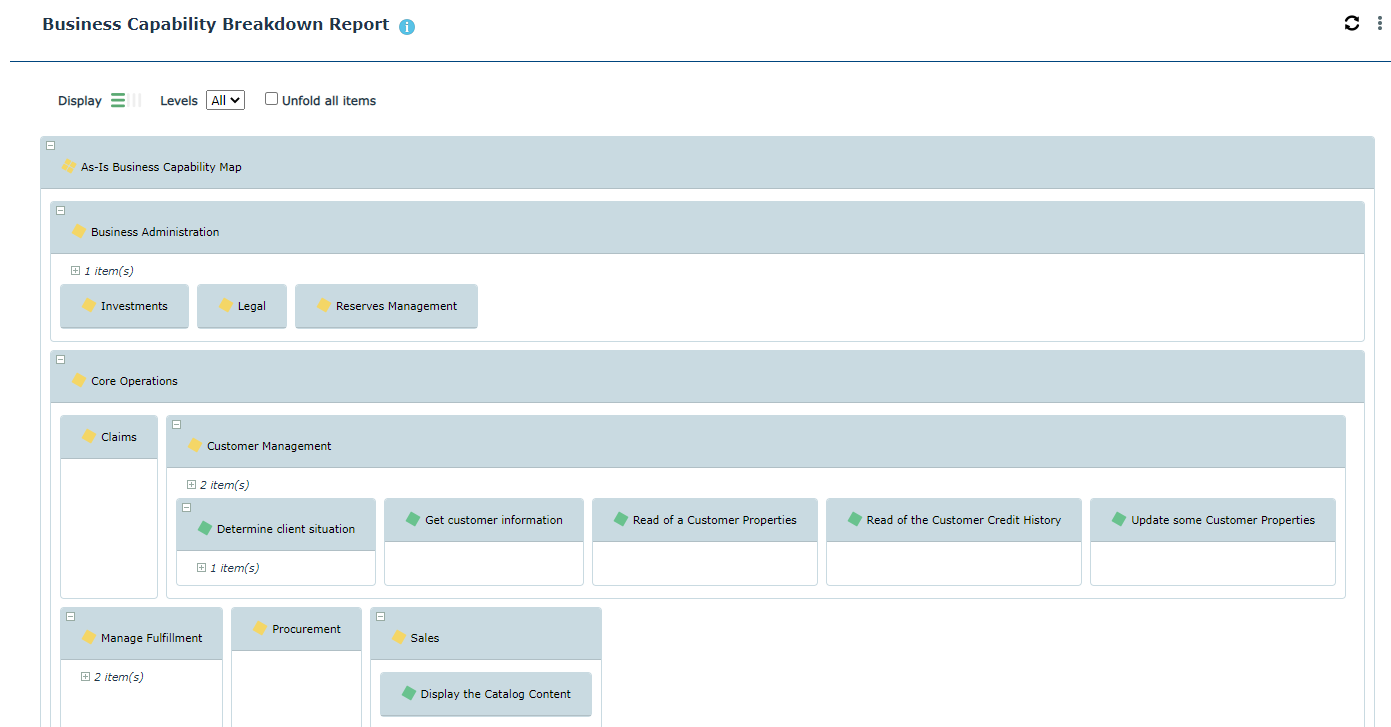 You can use this report to display the realization coverage of business capability elements by operational elements such as logical and physical applications, application systems, etc.