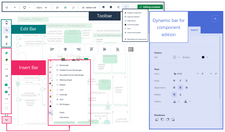 Select All Selects all the diagram elements (objects, graphical forms, texts). | |