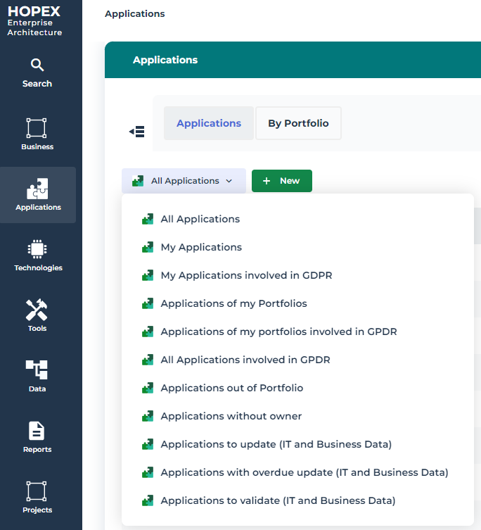 As an Enterprise Architect you can access applications from the Applications navigation pane of the HOPEX Architecture desktop.