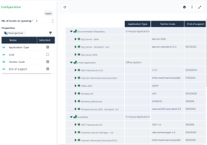 It also displays Properties: "Application Type" and "Cost" values of each application, and "Techno Code" and "End of support" date of each technology.