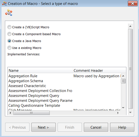Depending on the macro use case, the instanced class must implement a specific interface. It is via this interface that the plug-in will be called. In HOPEX, the functionalities that can be implemented in VB script can also be implemented in Java.