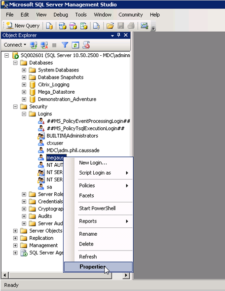 13. Right-click the account that you will use to connect the application to SQL Server (for example: login « megausr ») and select Properties.
