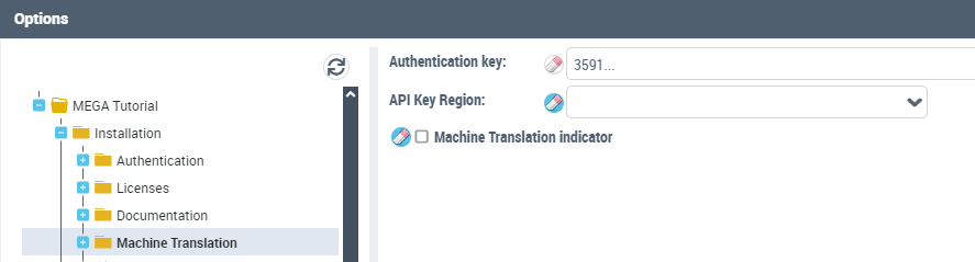 An option enables an administrator to enter the Authentication key number and its region, enabling activation of the automatic translation APIs.