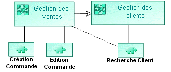 Répartition des traitements entre une application cliente et une application serveuse. Il est également possible de préciser quels services définis dans l'application serveuse sont utilisés par l'application cliente.