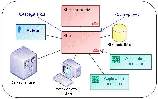 Un site peut être composé de sites et avoir des sous-types. Son organisation est fournie par les acteurs qui y sont rattachés. Il peut recevoir et émettre des messages. Un site peut être connecté à d'autres sites. Une application peut être utilisée sur un site et être exécutée sur un autre.