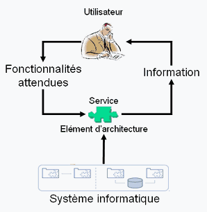 Les services peuvent être mis en correspondance avec les opérations réalisées à chaque étape des processus métiers de l'entreprise. Les services se présentent ainsi comme point d'articulation entre les métiers et l'informatique. Les métiers les voient par le biais des fonctionnalités rendues, les informaticiens les voient en tant qu'éléments d'architecture du système.